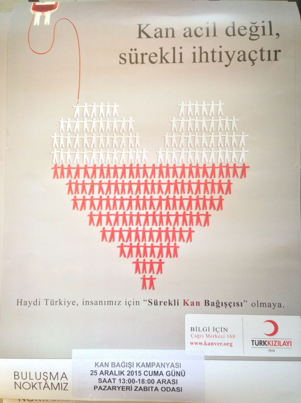 25 Aralık 2015 Cuma günü saat 13:00-18:00 arası İlçemiz pazar yeri Zabıta bürosu önünde kan bağışı yapılacaktır. Vatandaşlarımıza duyurulur.