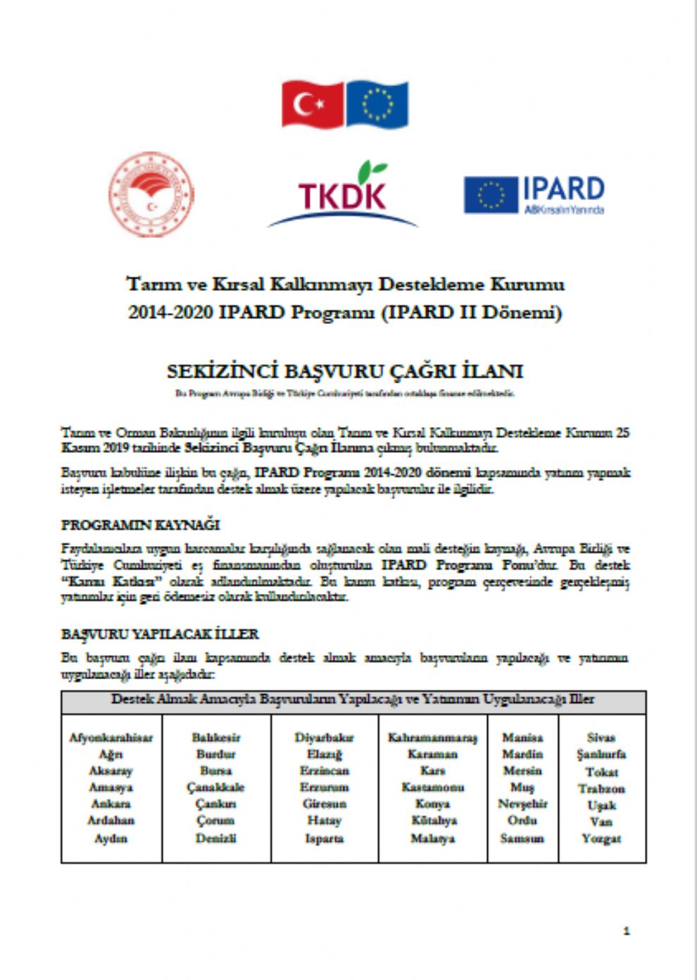 Tarim Ve Kirsal Kalkinmayi Destekleme Kurumu (Tkdk) 2014 - 2020 Ipard Ii Programi Seki̇zi̇nci̇ Başvuru Çağri İlani